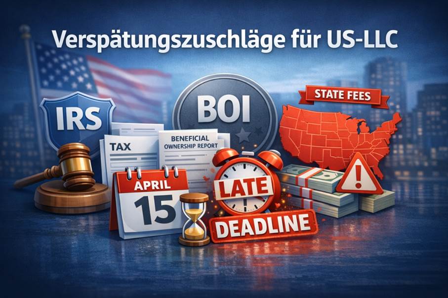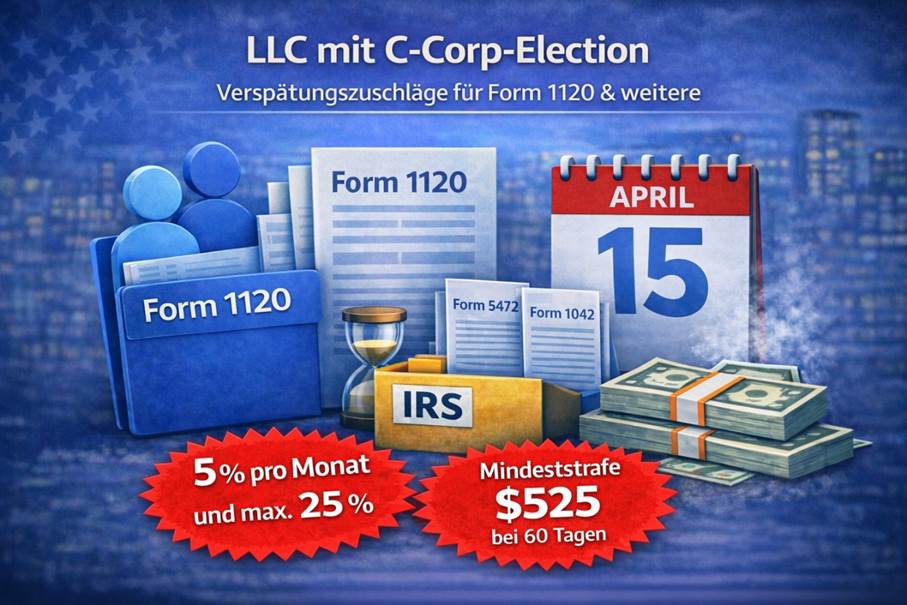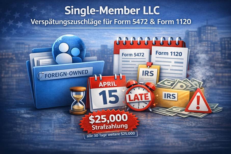Form 5472 | Single-Member LLC, C-Corp | 15.04. (bei Kalenderjahr; sonst 15. Tag des 4. Monats nach Steuerjahr-Ende) | 25.000 USD (je Verstoß; +25.000 USD je weitere 30 Tage nach IRS-Mitteilung) |
