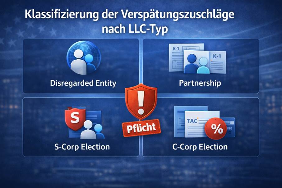 Ein maßgebender Faktor bei der Bestimmung des Verspätungszuschlags ist die Einordnung des Unternehmens. So kommen für eine LLC etwa bei einer steuerlich nicht eigenständigen Einheit („disregarded entity“), Personengesellschaft („partnership“), S-Corp-Wahl („s-corp election“) und C-Corp-Wahl („c-corp election“) unterschiedliche Formulare, Fristen und Strafen zur Anwendung.