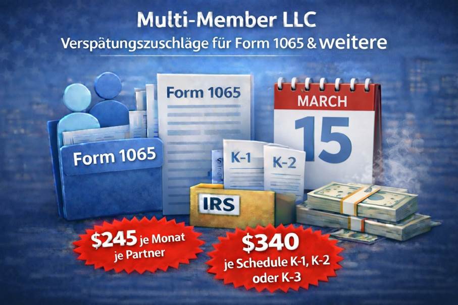 Form 1065 | Multi-Member LLC | 15.03. (bei Kalenderjahr; sonst 15. Tag des 3. Monats nach Steuerjahr-Ende) | 245–255 USD pro Partner/Monat (jährlich angepasst; max. 12 Monate) |