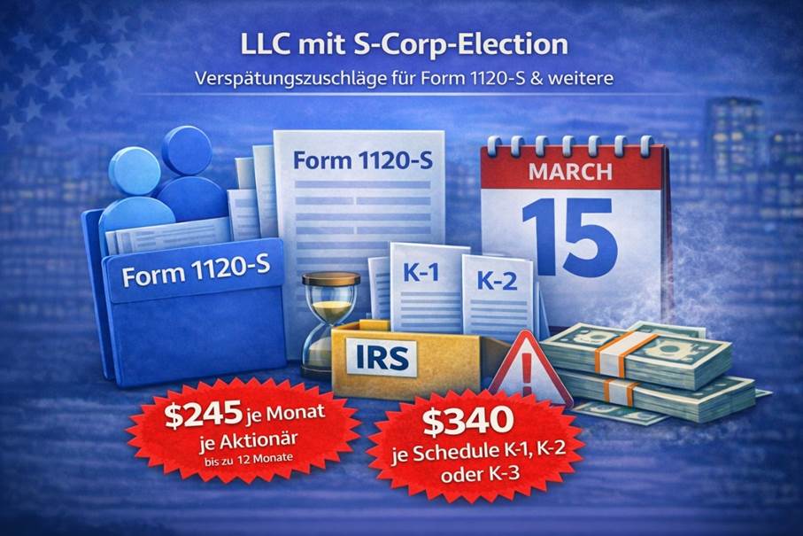 Die LLC mit S-Corp-Wahl kommt bis auf Ausnahmen wie Trusts nur für in den USA ansässigen Personen zur Anwendung. Dabei beziehen sich die Strafen auf die Inhaber und die Monate, wobei ebenfalls bis zu 12 Monate angerechnet werden. Im Jahr 2025 wurden bei einer Verspätung von Form 1120-S mit Abgabefrist am 15. Tag des 3. Monats pro Partner und Monat 245 USD verhängt.