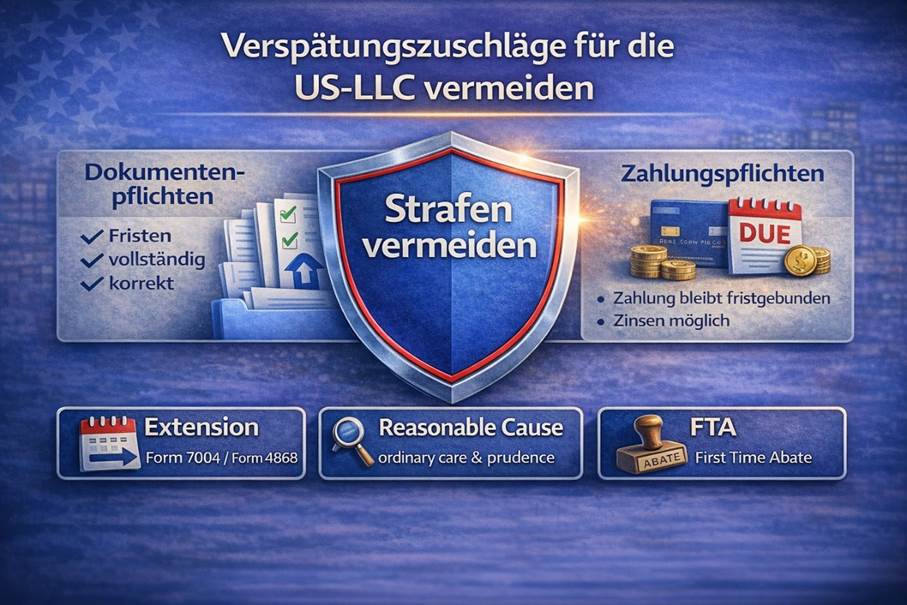 Idealerweise werden die IRS-Strafen durch einen rechtzeitig gestellten Verlängerungsantrag mit Form 7004 oder Form 4868 vermieden. Zudem gibt es auch bei einer sorgfältig und vorsichtig geführten LLC vernünftige Gründe, die anerkannt werden, wie Krankheit und technische Probleme. Ebenso kann First Time Abate unter bestimmten Voraussetzungen bei Standard-Strafen helfen.