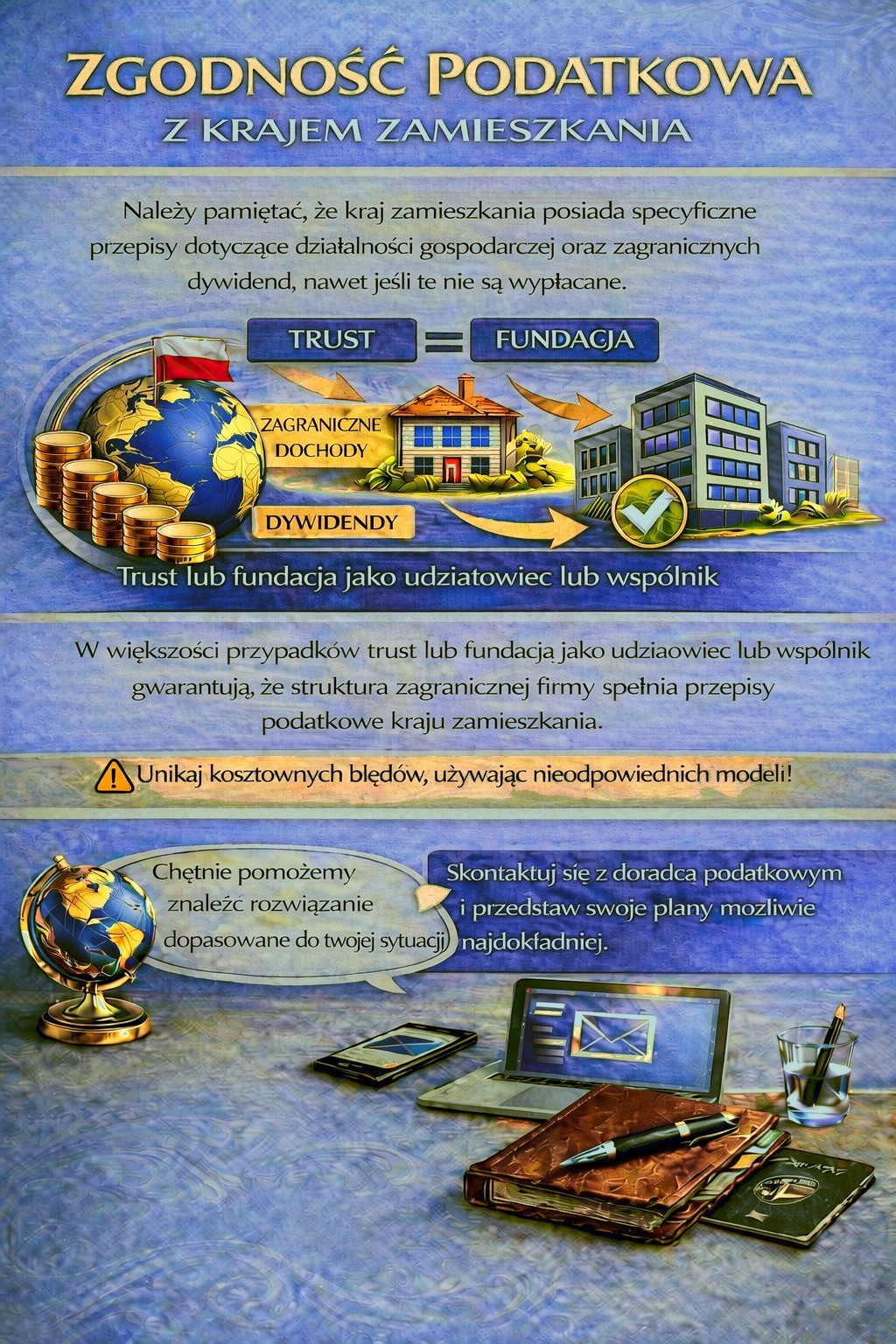 W zależności od Twojej sytuacji osobistej może być wymagana odpowiednia struktura holdingowa, aby spełnić wymogi przepisów podatkowych i uniknąć niepotrzebnych ryzyk podatkowych.