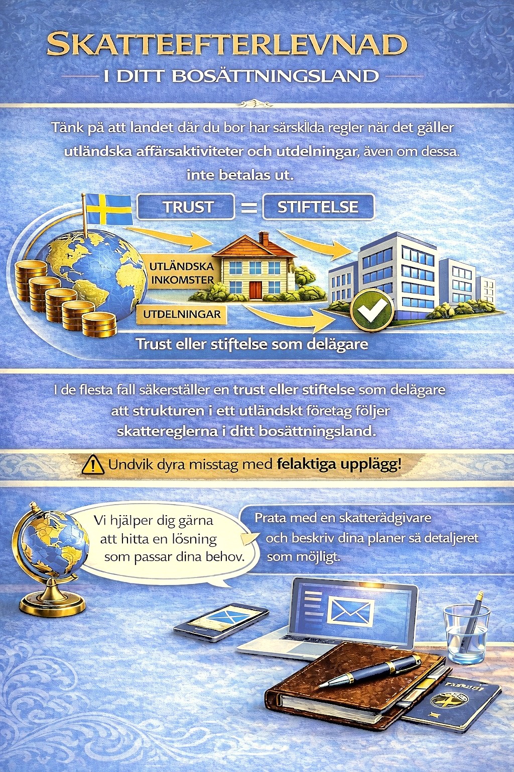 Ditt bosättningsland kan föreskriva skatte- och rapporteringsskyldigheter för utländsk affärsverksamhet och utdelningsinkomster, i vissa fall till och med när vinster inte delas ut.